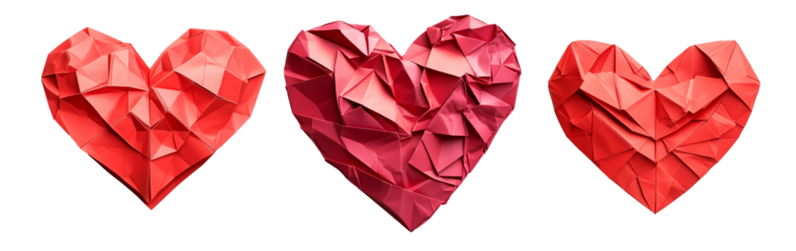 Red origami heart with geometric folds, crafted from paper, isolated on white transparent background. Concept of love and handmade art