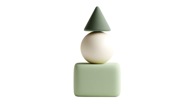 A precarious vertical stack of soft geometric forms in muted green and white hues on a plain white background