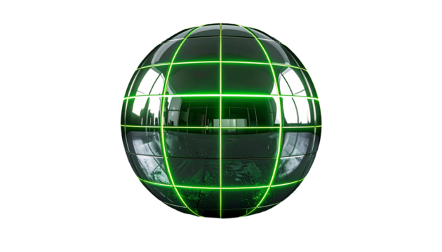 Shiny green sphere overlaid with a glowing grid, on a black background