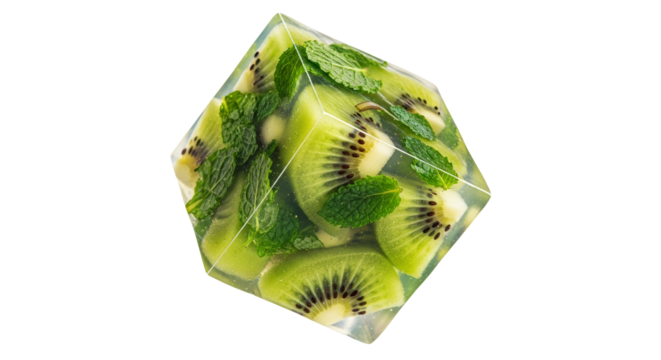 Geometric delight: A mesmerizing cube of fresh kiwi slices and fragrant mint leaves suspended in crystalline brilliance