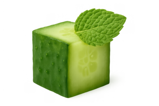 Cucumber cube with fresh mint leaf creating a unique blend of natural and geometric elements on transparent background