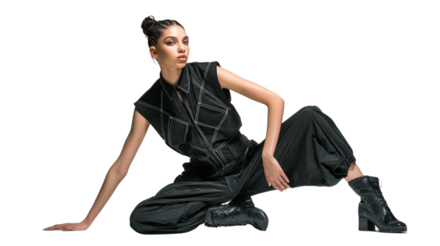 Model in a sleek jumpsuit with geometric accents, posing dramatically, isolated on a Transparent background, PNG file.