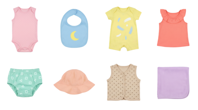 Baby clothes set including bodysuit, bib, romper, shirt, bloomers, sun hat, vest, and blanket isolated. Newborn apparel and accessories collection.