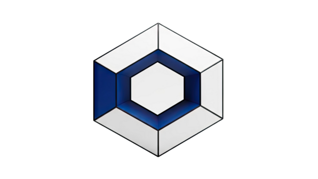 3D Hexagonal geometric shape with blue and white facets on transparent background