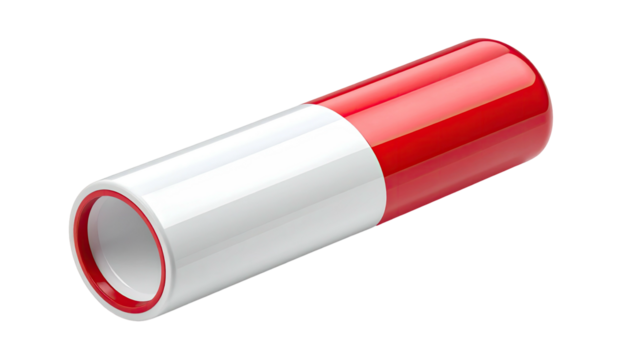 A cylindrical object, white and red, appears to be a capsule, isolated on a black background