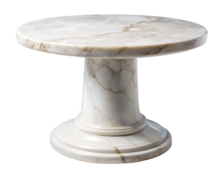 White marble display table with a round base and natural veining, ideal for modern interiors or luxury decor settings. Polished and stylish for a refined look. Isolated on transparent background, png.