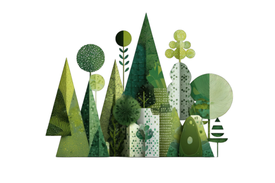 Abstract woodland scene, stylized with geometric shapes and various shades of green