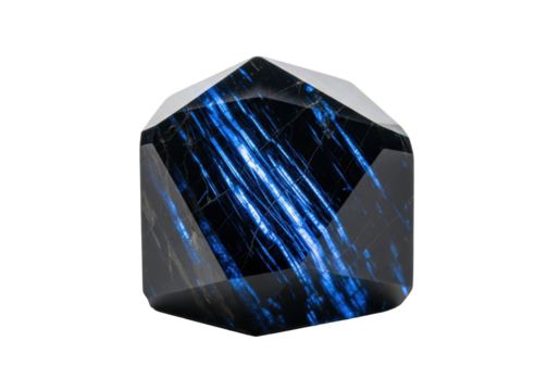 Macro shot of a polished obsidian geometric mineral with glowing sapphire blue veins on a stark white background, copy space, cinematic light, concept of rare cosmic energy