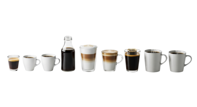 eight assorted hot coffee vessels (espresso, detailed latte art, drip) with visible steam arranged geometrically on a reflective, transparent studio table, concept for beverage advertising