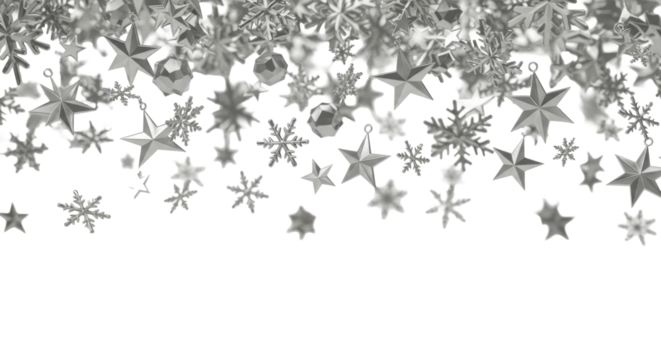 macro shot of reflective metallic silver stars and geometrically complex snowflakes falling/drifting against a high-key transparent background, enhanced by dramatic cinematic studio lighting.