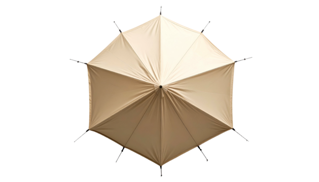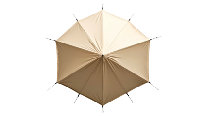 Overhead view of a tan, hexagonal, canvas-like shelter with dark poles radiating out