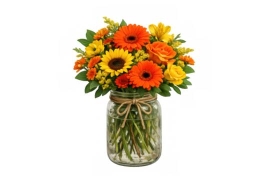 PNG image of Vibrant bouquet of mixed colorful gerbera daisies and roses elegantly wrapped in brown paper on transparent background