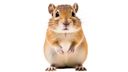 A close-up view of a cute. fluffy gerbil with soft fur and bright eyes. posed on a clean white background. its playful demeanor and natural curiosity