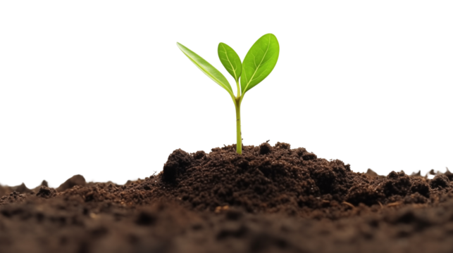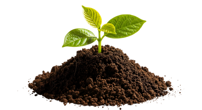 A vibrant young plant flourishing in a pile of rich, dark soil, symbolizing growth, renewal, and the beauty of nature, isolated on transparent background
