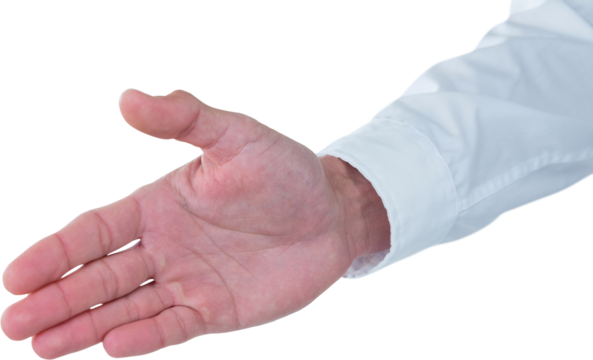 Smiling caucasian businessman on transparent background gesturing cheerfully