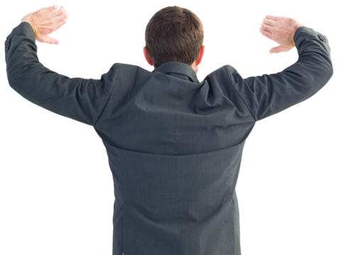 Caucasian businessman playfully gesturing with glasses on transparent background