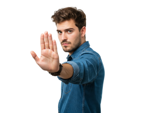 Serious Man Showing Stop Hand Gesture Denim Shirt Studio Male Sign Halt Black Model Limit Power