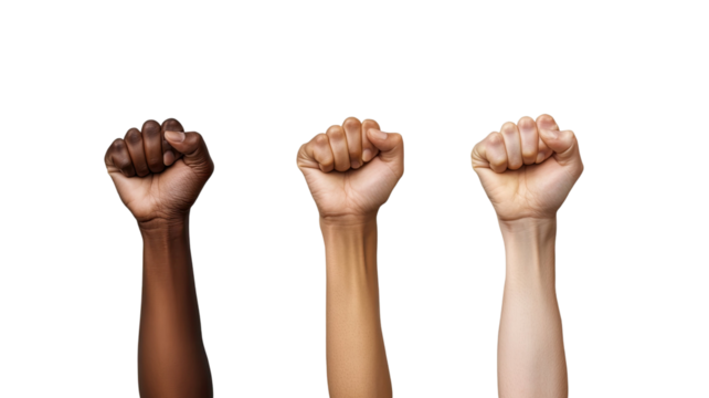 Fists raised upward powerful gesture of unity strength resistance determination protest symbol bold human expression isolated on white background