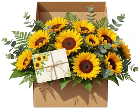 Abundant sunflower bouquet with a greeting card in an open brown box on a transparent background