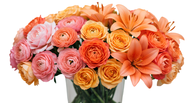 A vibrant bouquet of peach and apricot ranunculus and lilies radiates warmth a symbol of love and celebration against a
