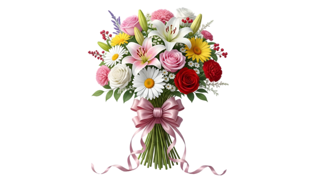 A vibrant bouquet of assorted flowers with pink ribbon