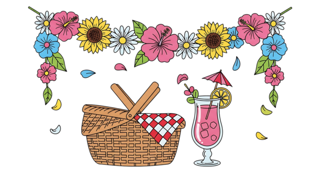 Whimsical summer picnic scene with flowers, basket, cocktail, and decoration