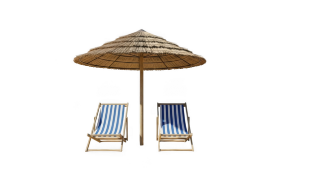 Beach umbrella and lounge chairs offer shade for relaxing vacation moments