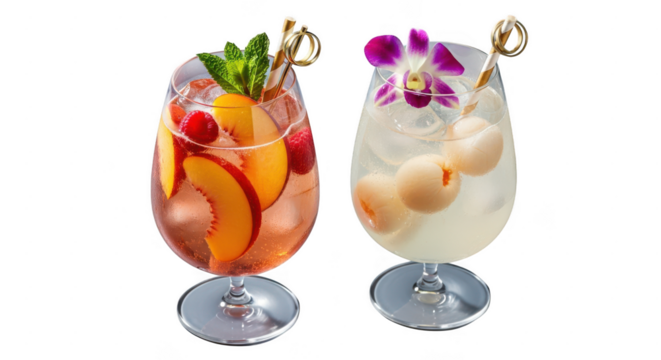 Two refreshing cocktails isolated on transparent background, one with peach, raspberry, and mint, the other with lychee and orchid, perfect for a summer party or a tropical getaway