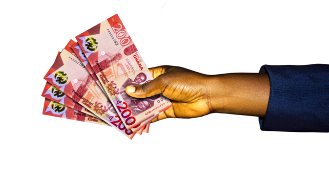 Black lady woman female hand in suit holding  200 Ghana cedis note over transparent background, currency of Ghana