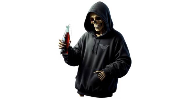 Skeleton figure wearing a hoodie and holding a red liquid-filled bottle against a white background.