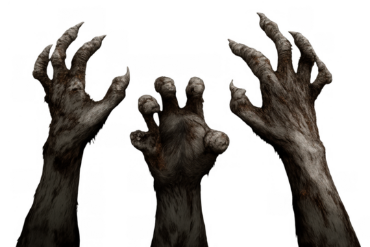Zombie monster hands reaching with clawed fingers and decaying skin, an undead horror concept with transparent background