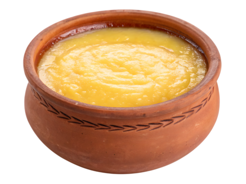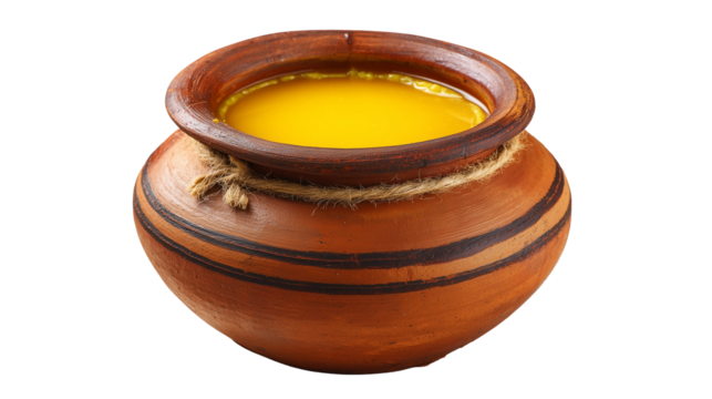 Smooth golden butter ghee in a traditional earthen clay pot isolated on transparent background