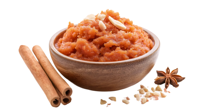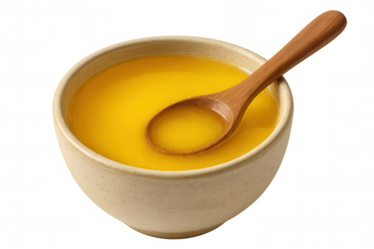 Golden ghee swirl in terracotta bowl isolated on transparent background