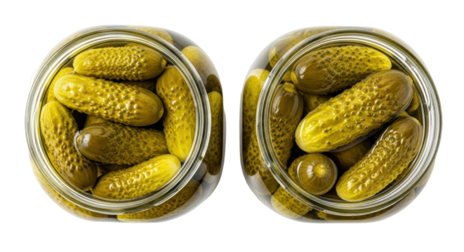 Delicious pickled gherkins dill pickles food condiment snack appetizer fermented cucumbers isolated on transparent background
