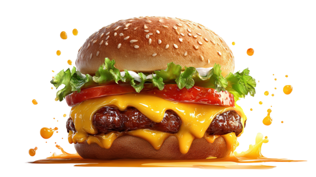A cheese burger with bacon, salad, relish and gherkins against a white background