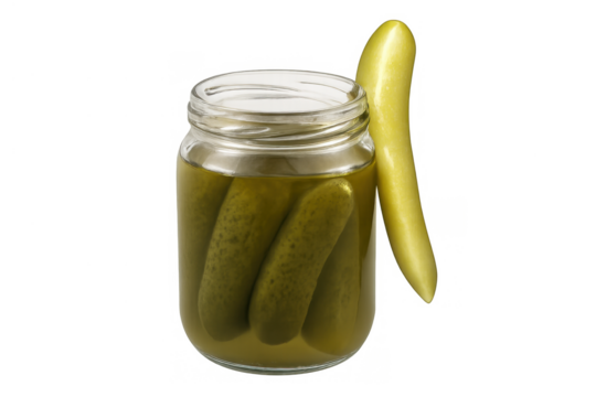 Pickled cucumbers in a glass jar isolated PNG, homemade gherkins with spices on transparent background, traditional fermented food