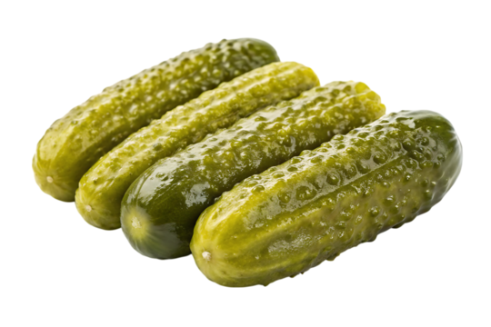 Pickled gherkins arranged neatly, isolated on transparent background, shiny texture, high-resolution product photo