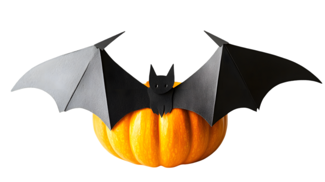 Gray cat in bat costume with pumpkins and ghost decoration for halloween celebration on transparent background