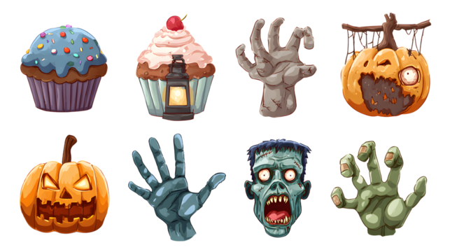 Halloween cupcakes and spooky monster hands with jack-o-lanterns collection, perfect for Halloween party decorations and themed events