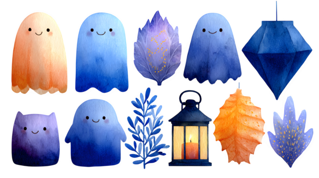 Watercolor collection of cute Halloween ghosts and festive decorations, isolated on white background