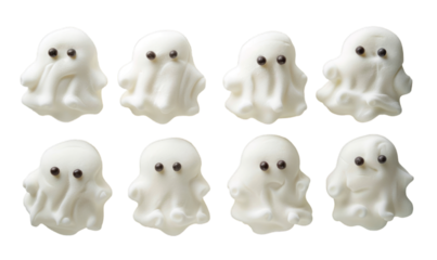 Three adorable fluffy white ghost-shaped candies with black eyes and mouths, isolated on a white background.