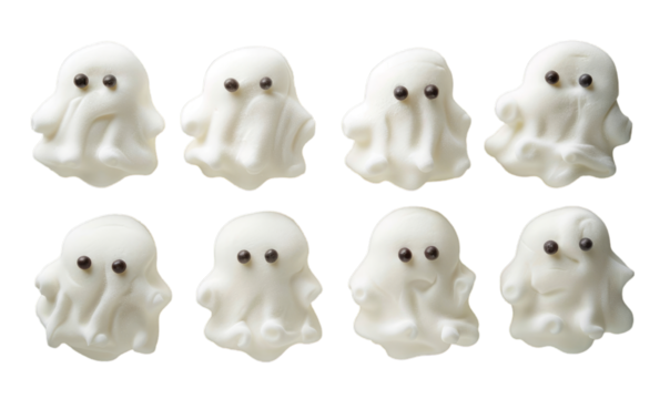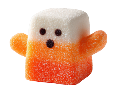 Spooky ghost shaped marshmallow snack with orange and white sugar coating, cute expression, festive and playful Halloween treat, isolated on transparency background