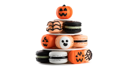 Festive Halloween macarons shaped like pumpkins and ghosts arranged pyramid style, isolated on white background