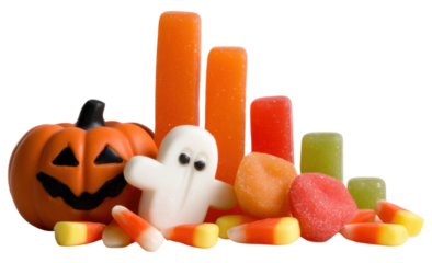 A colorful assortment of Halloween-themed candies, including a pumpkin, ghost, and various shaped sweets.