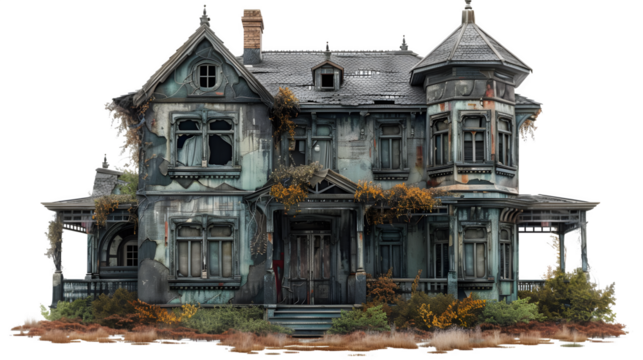 Haunted mansion with gnarled trees on transparent background