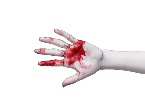 A bloody hand with splatter marks on the palm and fingers.  The hand is white and the blood is red.