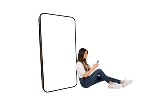 Big smartphone, caucasian girl sitting floor with phone on her hand and leaning bis smartphone. Blank white screen huge giant mobile phone mockup. Product, website, mobile application placement.
