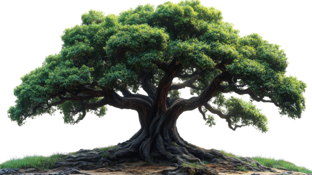 The Majestic Canopy: A magnificent, large tree with a sprawling, verdant canopy, its thick, textured trunk firmly rooted in the earth, presenting a scene of resilience and longevity.