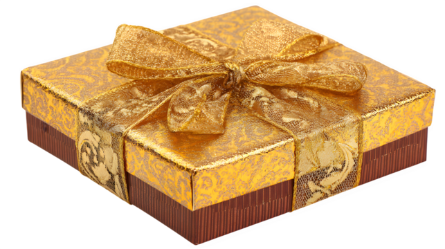 An isolated golden gift box with a red ribbon and bow, wrapped in decorative paper as a festive Christmas or birthday celebration surprise package for a holiday anniversary