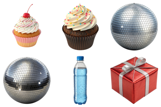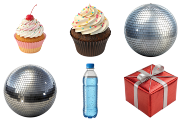 Cupcake with cherry chocolate cupcake with sprinkles disco ball mirrored sphere disco mirror ball water bottle gift box party dessert